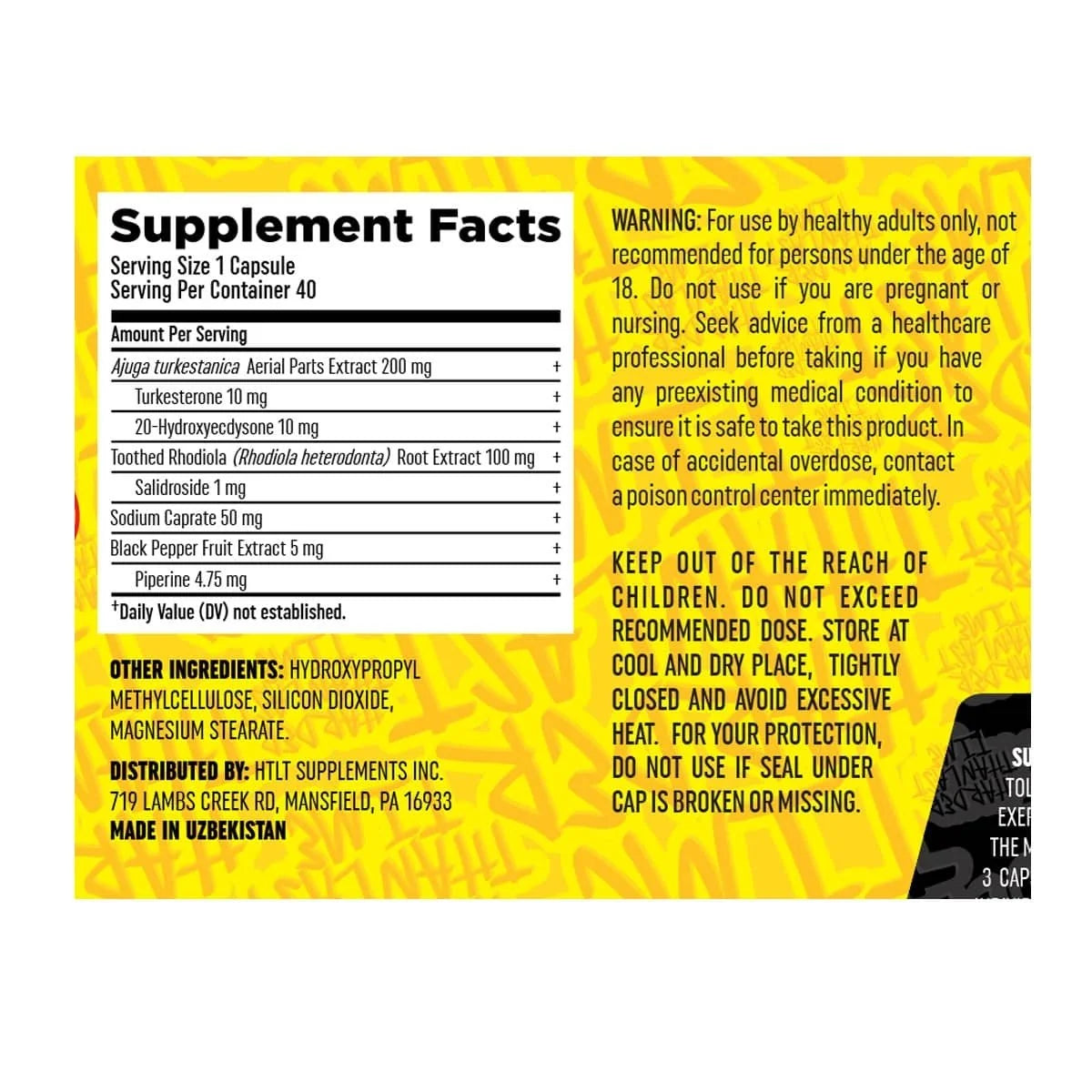 After years of searching for genuine sources, HTLT secured authentic turkesterone from the mountains of Uzbekistan, ensuring quality and potency in every capsule. Each serving provides: