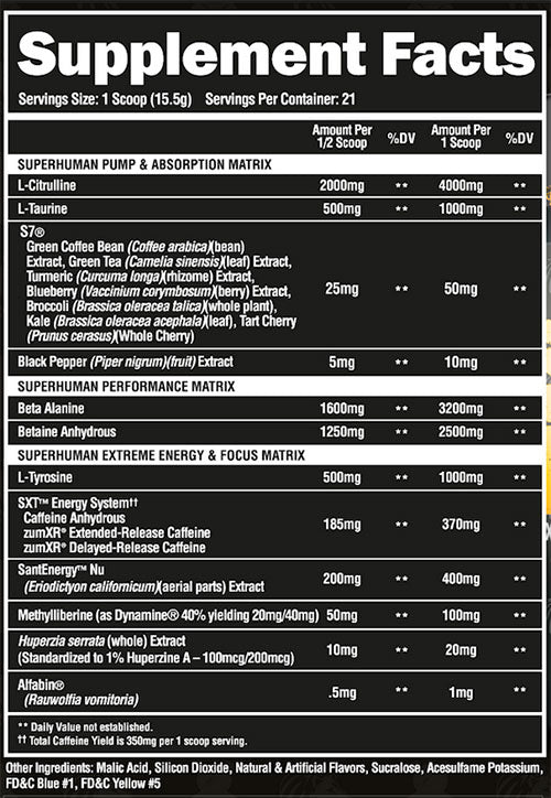 SuperHuman Extreme Energy & Focus Matrix: These ingredients work together to give you out-of-this-world energy, alertness, and concentration so you can train to your full potential.†
