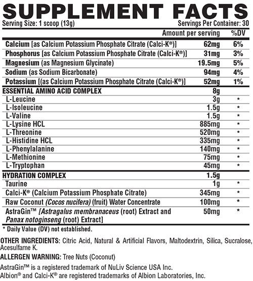 - Hydration Complex (Taurine, Calci-K, Raw Coconut Water Concentrate, AstraGin [Astragalus membranaceus extract and Panax notoginseng extract]): Electrolytes for optimum hydration.