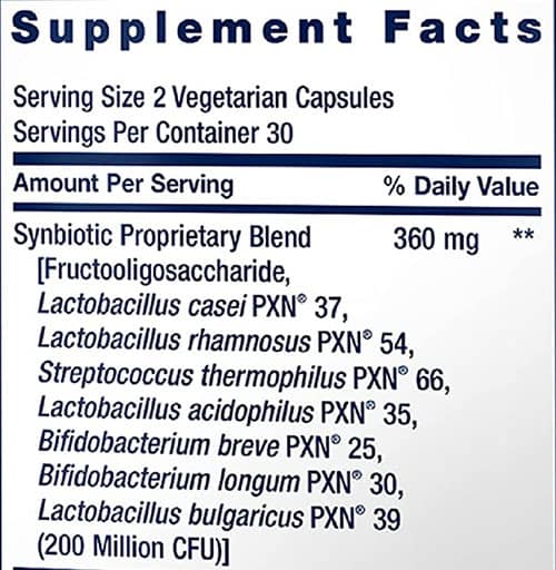 - [Fructooligosaccharide, Lactobacillus casei PXN 37,Lactobacillus rhamnosus PXN 54,Streptococcus thermophilus PXN 66,Lactobacillus acidophilus PXN 35,Bifidobacterium breve PXN 25, Bifidobacterium longum PXN 30,Lactobacillus bulgaricus PXN 39, (200 Million CFU)]